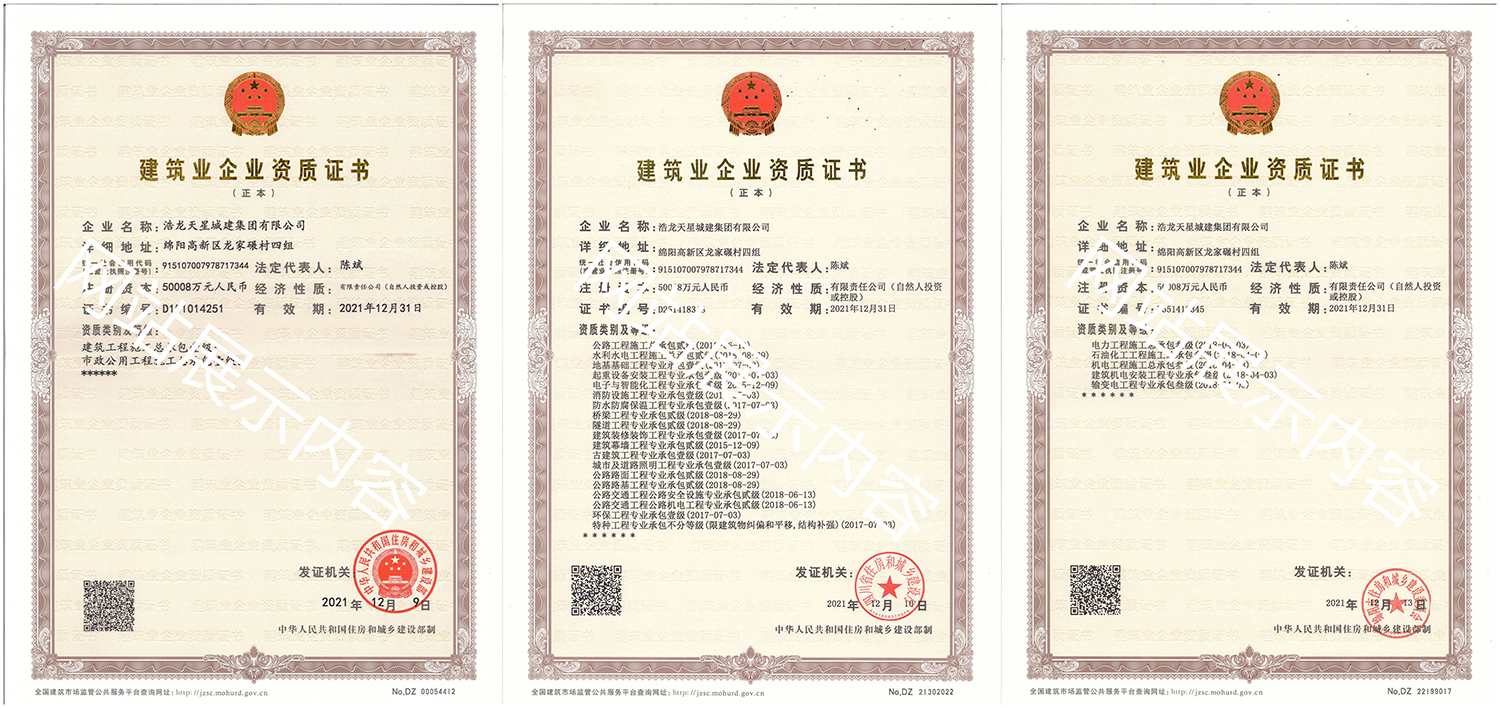 浩龍?zhí)煨浅墙瘓F有限公司,2007年成立于“李白故鄉(xiāng)、中國科技城”—四川省綿陽市,企業(yè)注冊資本金5.0008億元。公司共有27項建筑業(yè)企業(yè)資質(zhì),其中國家一級資質(zhì)11項,二級資質(zhì)10項,三級資質(zhì)5項,特種資質(zhì)不分等級1項,類別涵蓋建筑、市政、水利、機電、隧道、起重設(shè)備安裝等基礎(chǔ)及未來發(fā)展重點專業(yè)。公司...